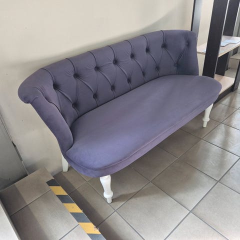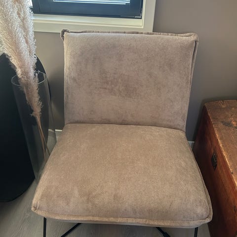 Veldig kjekk lenestol. Den er laget av blå stoff og kan vaskes.