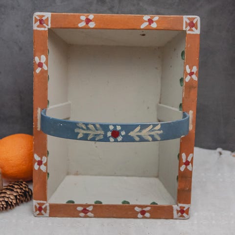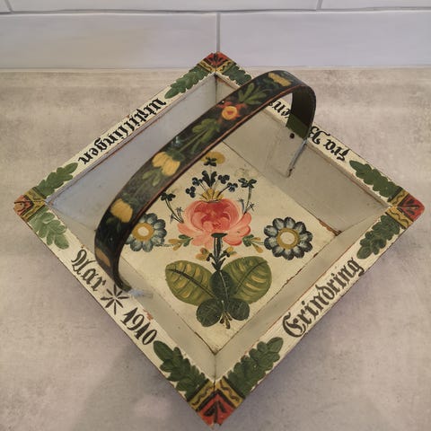 Gammel rosemalt sendingskurv. Den er ikke i «perfekt» stand, men har derimot mye patina! Kurven er nydelig dekorert med fargerike blomstermotiver og gulldetaljer.
