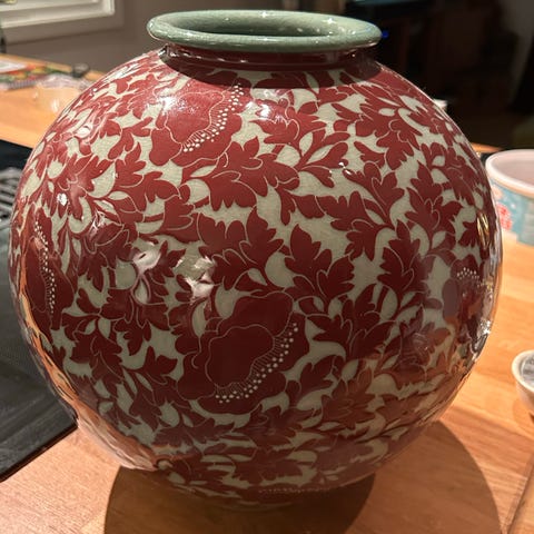 Håndlaget fin liten krukke fra Thailand. Bredde ca 20 cm. Høyde ca 13 cm.