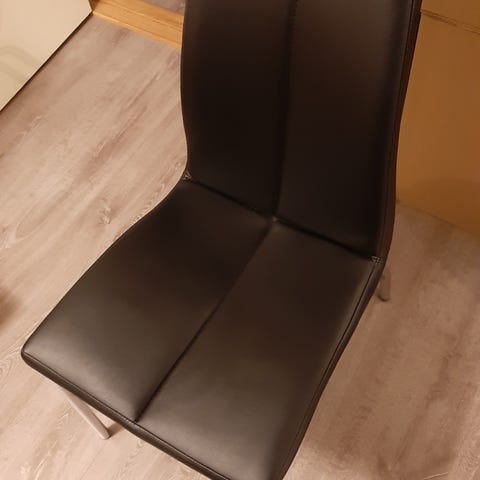 6 Novel spisestoler i svart kunstskinn (PU) og børstet stål understell. Kjøpt på bohus i 2020. Pent brukt ingen bruksmerker eller slitasje. Før pris 1699 kr per stk. Nå selges de samlet til 5500 kr.