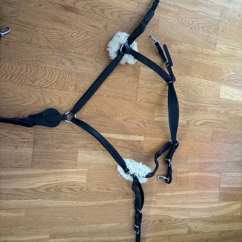 Brunt Shires sailsbury fempunktsfortøy str. full. Saueskinnet er festet med borrelås, så det er enkelt å ta av og vaske ved behov. Brukt noen få ganger. 450kr.