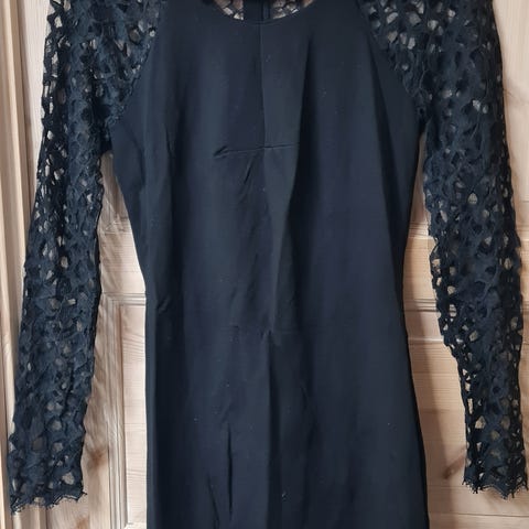 By malene Birger, style Moliano. Svart kjole i blondestoff. Laget av polyamid. Lining i miks av viskose og polyester. Trim laget av silke. Ingen merker - kjolen fremstår som ny.