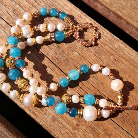 Et nydelig kulturperlekjede med apatitt og krystaller. Øredobber medfølger.