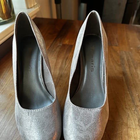 Komfortabel hælhøyde ca 5,5 cm. Str 36. Hælkappeinnlegg medfølger fast i skoene.