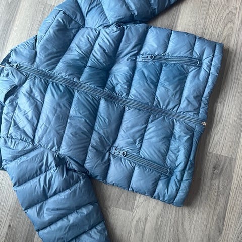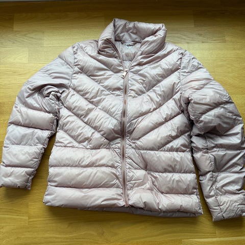2 tynne lette dunjakker i str 110 og 128, tar veldig liten plass i tilhørende poser. Selges for 150 kr pr stk