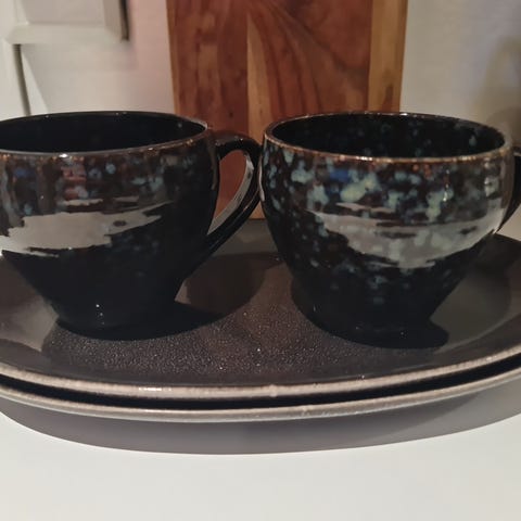 Kanel-krukken mangler litt av gullet i kanten, ellers er de iorden. Se bilder av krukkene.