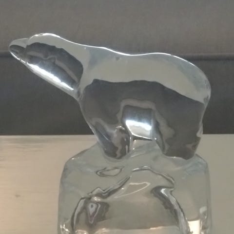 5. Liten fin papirvekt med isbjørn motiv fra Hadeland glassverk i tung krystall. Mål: 7 x 7 cm.