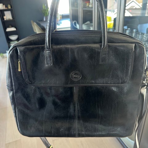Delt opp i to deler, med flere lommer med glidelås. Kjøpt i Oslo for mange år siden i en veskeforretning som nå er lagt ned. Helt ny, med lapper på.