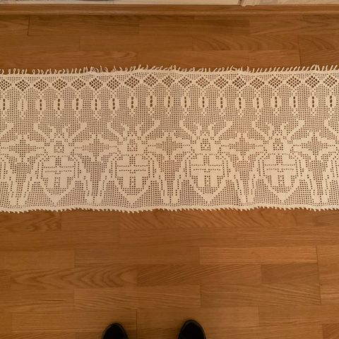 (Nr.5) Flott heklet kappe, gardin, pyntegardin, 132 cm, selges.