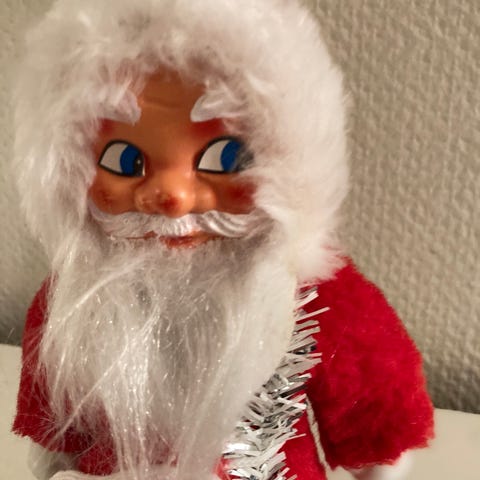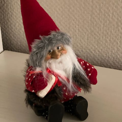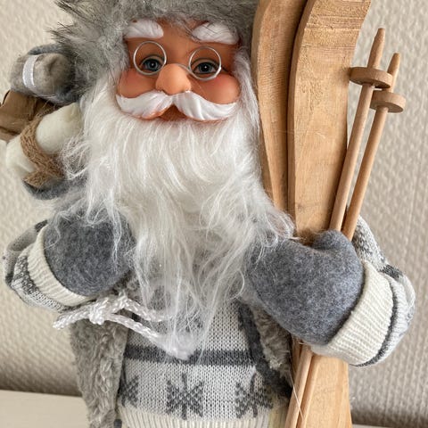 Lang og bøyelig nisse. Lodd i bena gjør at den står uansett hvordan du vrir og vender på den. Høyde ca 83 cm.