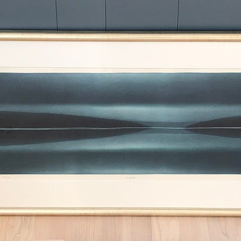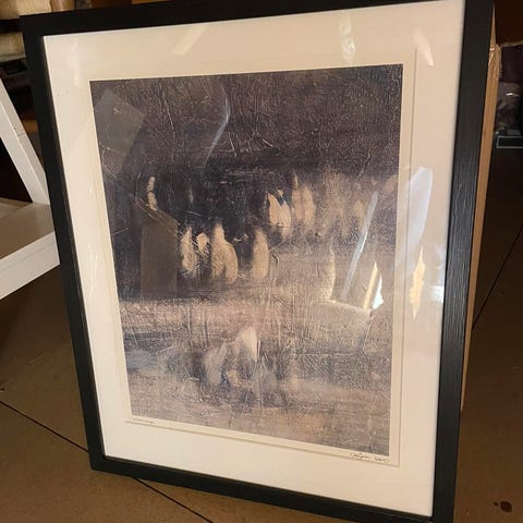 «Hus» (mezzotint) av Terje Risberg selges innrammet for kr 2.000,-. Trykket er nummerert (184/200) og signert av kunstneren.