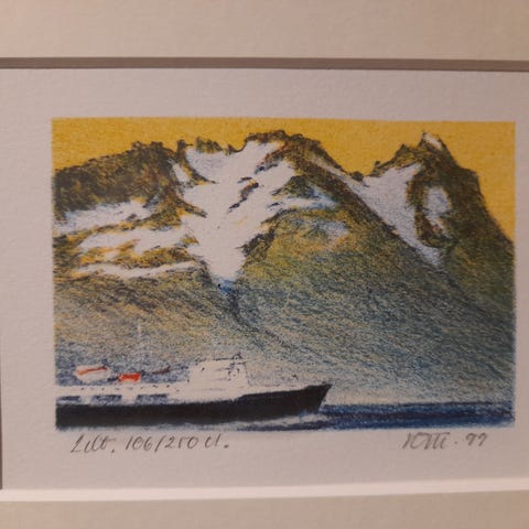 Litografi av Reidar Fritzvold, innrammet. Ett av mange litografier med motiver fra fjellheimen i Vest-Telemark og Setesdalen. Nummerert 71/200
