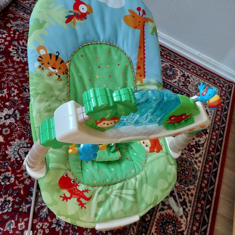 Vippe stol fra FisherPrice i veldig god stand, alle elektroniske deler funker feilfri! Den ble frukt for 1 baby og etterpå til utstilling for rebornbabier, når jeg kontrollerte den fant jeg dessverre et hull under side (se bilde 11), også to 2 virkelig små fleker (se bilde 10) fant jeg som også er synlige etter vask (kommer altså ny vasket).