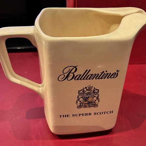 Selger min vintage Ballantine's Whiskey markedsføring-vannmugge/ Karaffel fra 80 tallet eller tidligere. Arvet av min far og husker den fra min tidlige barndom. Laget av Wade PM England. Det er et lite skår / liten kosmetisk skade. Selges til h.b.o. eller for 299 kr. Ikke PRUT da får du ikke svar. Kul nostalgisk sak i manne hulle / Man Cave o.l............. . Ser helst at blir hentet i Lillestrøm Sentrum. Kan sendes med Finn.no Fiks ferdig frakt.