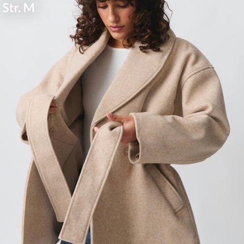 Beige strikket jakke med knyting i livet. Fra gina trucot. Str L. Ubetydelig brukt.Må hentes.