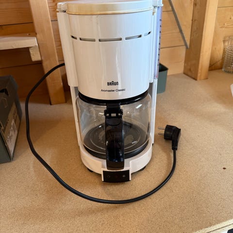Velfungerende kaffemaskin fra Braun. Brygger god kaffe! Med dryppstopp og filter som svinges ut og kan tas opp (gjør det enkelt og legge i og ta ut filter/kaffe). Noe misfarging inni og på lokket til glasskannen (fra kaffen) en liten skade foran (se bilde), men ganske diskre. For filtermalt kaffe.