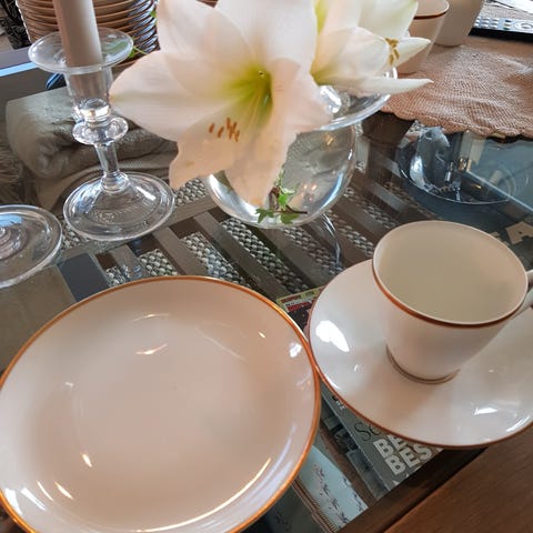 Fint kaffeservise fra Porsgrunn Porselen. Serviset er arvet, og er pent brukt. Det er hvitt med gulldetaljer. Det inneholder 12 tallerkner, 12 asjetter, 9 kopper, en skål, to mugger og en sukkerskål. Det er også en asjett som ikke er en del av serien som kan fås i tillegg dersom det er ønskelig.