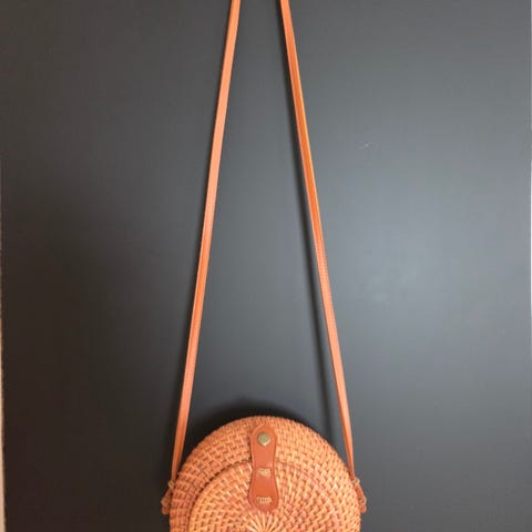 Flettet rund veske. Begge to er 16 cm i diameter. Lærrem og bomullsfor. Håndlaget i Vietnam. Ikke brukt.