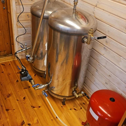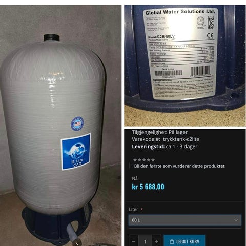 Wellmate 75L trykktank. Belgen inn i tanken er defekt, men den kan byttes. Det er et hull i bunn av tanken for å ta den ut.