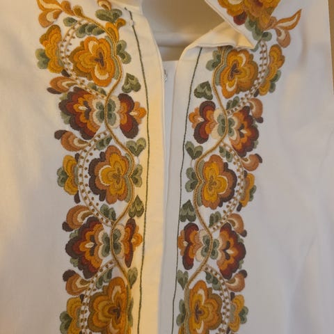 Brodert jakke fra Kashmir. Alle jakkene (se mine andre annonser), er brodert for hand (med symaskin), og er unike. Jakkene består av tynn ull ytterst, brodert med bomullstråd, og er foret med variabelt stoff, og har to lommer. Detter er altså en tynn sommerjakke, som kan brukes innendørs.