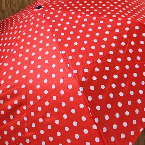 1 NY dame paraply. Den er sammenleggbar, og tar liten plass, lett å ha med seg, den veier kun 195 gram. Den ligger i et stoff omslag i samme materiale og samme mønster som paraplyen. Stangen trekkes ut i to lengder.