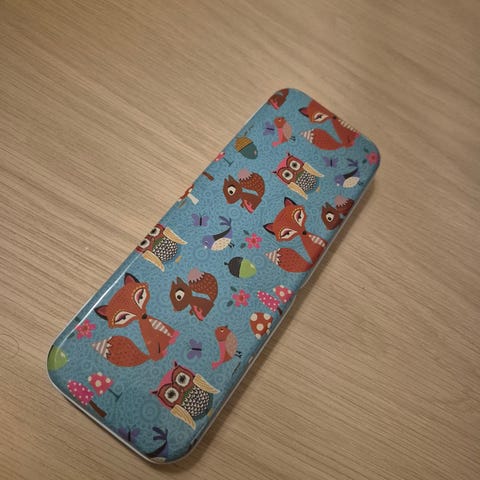 Penalhus fra en tid tilbake selges. Penalet har 3 rom med plass til diverse. Glidelåser fungerer godt. Innhold kan medbringes om ønskelig men er gammelt. To linjaler med hele alfabetet der man kan tegne i bokstav-utskjæringene medfølger.