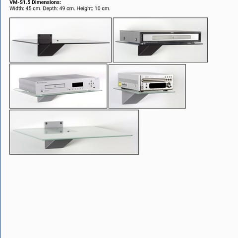 Stereo rack/hyller. Type Vm acoustics S1. Fire glass hyller i frostet glass med sølv veggfeste.