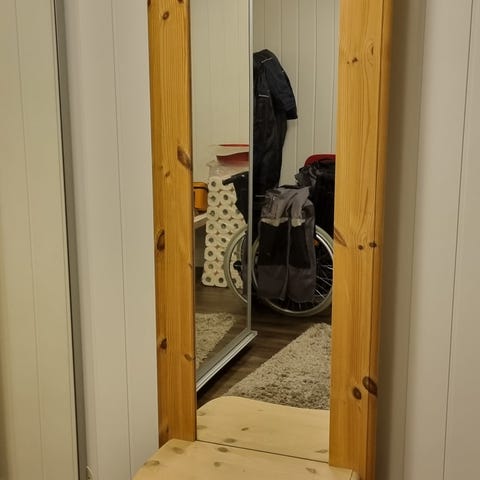 Meget pent speil med slepen kant, og brun dekorativ ramme, selges rimelig. Som nytt, uten bruksmerker av noe slag.