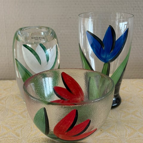 To ubrukte Kosta Boda boller selges samlet. Har vært glemt bort i et skap. Ulrica Hydman Vallien produkter som er merket med UHV i bunn(se bilde).
