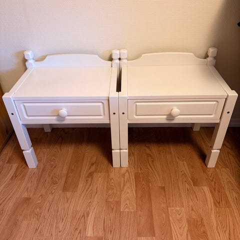 2 nattborde som vi har malt hvite og satt på nye gull farget knotter. Utrolig fine og solide. Det er noen hakker litt steder (slik er det med eldre møbler) 😊