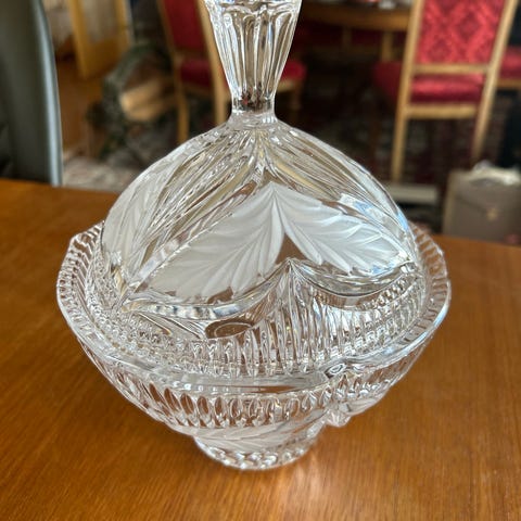 Krystall krukke med lokk i klart glass. Krukken har fasettert og dekorert overflate med mønster i glasset. Består av skål og tilhørende lokk med håndtak. Egner seg til oppbevaring av for eksempel godteri eller småting, eller som dekorativt innslag i interiøret.