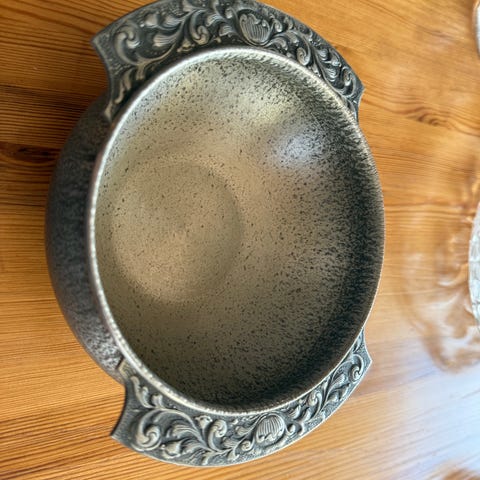 Bollen ser metallisk ut. Skinner. Veier 1,2 kilo . Måler : høyde 11 cm, og diameter 11,5 cm. Kr 200.- Porto kr 70.-.