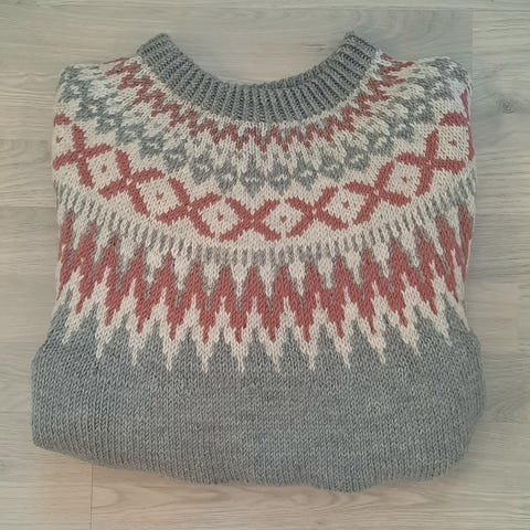 Rallergenser strikket i pure merino ull. Størrelse 12 år. Hjemmestrikka