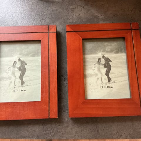 1 spesiell og meget flott dobbel bred treramme. Bilde størrelsen er 8 cm x 6,5 cm. Lengden er 20,5 cm, høyde 11 cm. Selve rammen rundt bildet er tykk, bredde 2,5 cm og tykkelse 2 cm. Rammen er pent brukt, ubetydelig merker. Fargen er rød lys brun (litt ubestemmelig farge). Fargen på bildene stemmer meget godt. Se bilder. Det er 2 rammer som henger sammen og som kan stå på et bord, eller lignende, eller henge på en vegg. Kan også fjerne det på baksiden som får de til å henge sammen. Rammen kan sendes, eller hentes her i Sandefjord. Kan også avtale henting i Tønsberg på Tolvsrød.