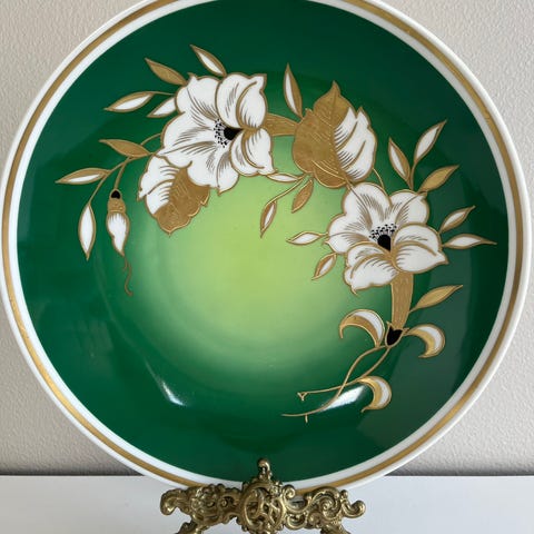 Pent brukt veggfat frå Tyskland (made in Germany) Blå farge med motiv av bru og vindmølle. 28 cm i diameter.