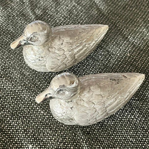 Salt og pepper bøsser i sølvplett. Selges uten fatet. Pent ivaretatt. Kan sende i post.
