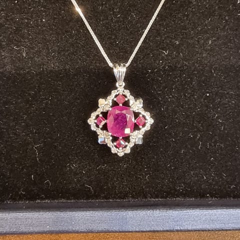 Anheng i sølv med rosa stein og blanke steiner. Vet ikke hva slags steiner det. Sølvkjede kan følge med for 100,-.