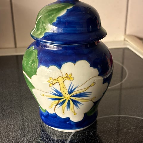 Jeg selger en nydelig liten keramikk krukke med lokk. Den har dessverre blitt limt og selges derfor billig.