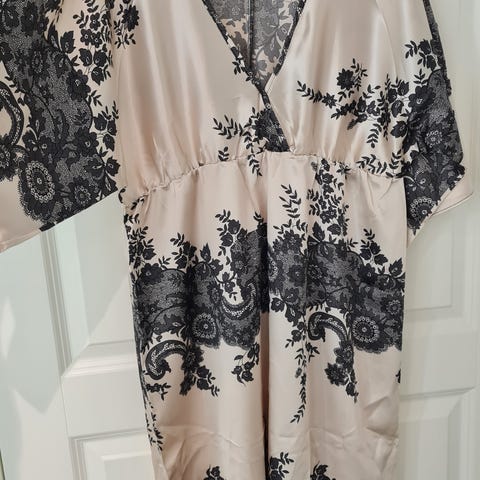 Tidløs kjole i mørkeblå silke. Løs passform, str L. Klassisk basisplagg som kan brukes til mye.