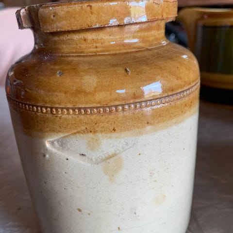 Hel og fin olje-flaske i glasert keramikk.