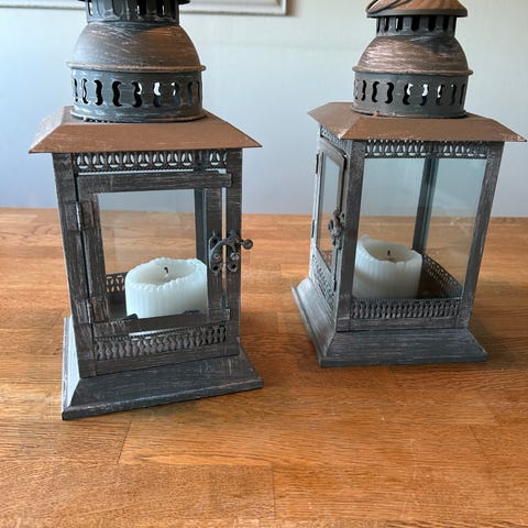 to høye lysestaker - en i malt tre, 33 cm høy fra 1960-tallet og en i metall. 26,5 cm høy, med fot, dia 10,5. Hvis samlet kr. 150,-. Eller- kr. 100,-, pr. stk.