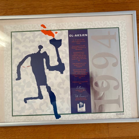 Nummerert eksemplar av Lillehammer OL aksje pent innrammet med glass. 32 x 37 cm.