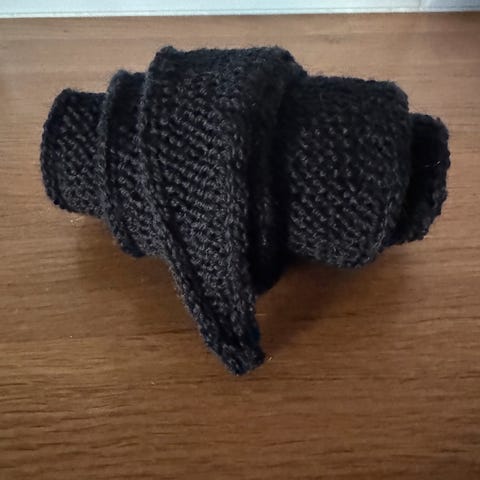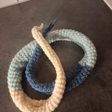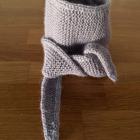 Selger et pent hjemmestrikket pelsskjerf. Tråden har sølvglimmer.