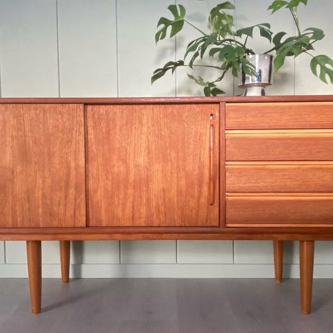 Nydelig høy teakskjenk med nyrestaurerte fronter | teak skjenk