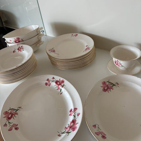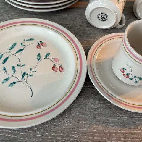 En pen eldre kaffeservise sett som består av 10 kopper, 12 asjett og 12 kakefat. Selges for 250kr😊