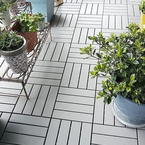 Dette terrassegulvsettet i treplastkompositt, med bord i størrelse 30 x 30 cm, kommer komplett med 22 deler, noe som gir en total størrelse på 2 kvadratmeter. Det er perfekt til terrasser, verandaer, baderom og ethvert sted i nærheten av et basseng eller spa.