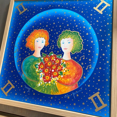 Signert og nummerert litografi av Valerie Hermant, stjernetegn løven. Opplag 100 romertall, dette er nummer 47/100 (xlvii/c). Ark-/motivmål 29x29 cm. Selges uten ramme. Kan sendes.