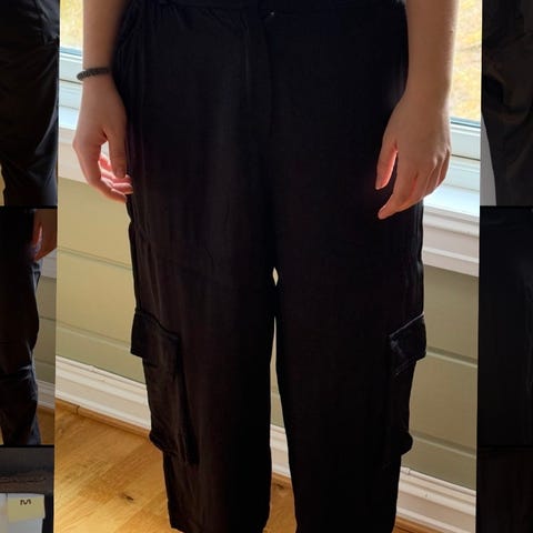 To skrå lommer (fronten) og en lomme bak (må fjernes tråd - har ikke brukt lommen).