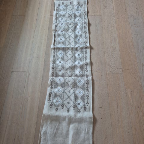 Pent brodert veggbilde med oppheng. Det måler 38cm x 48 cm. I tillegg kommer opphenget. Kan sendes. Betales med vipps.