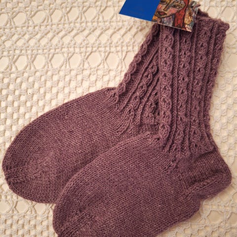 Ubrukte hjemmestrikka ullsokker i brunt med lys stjerne på helen.